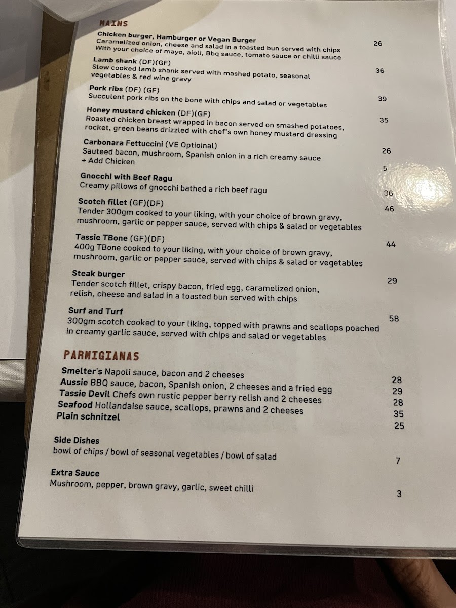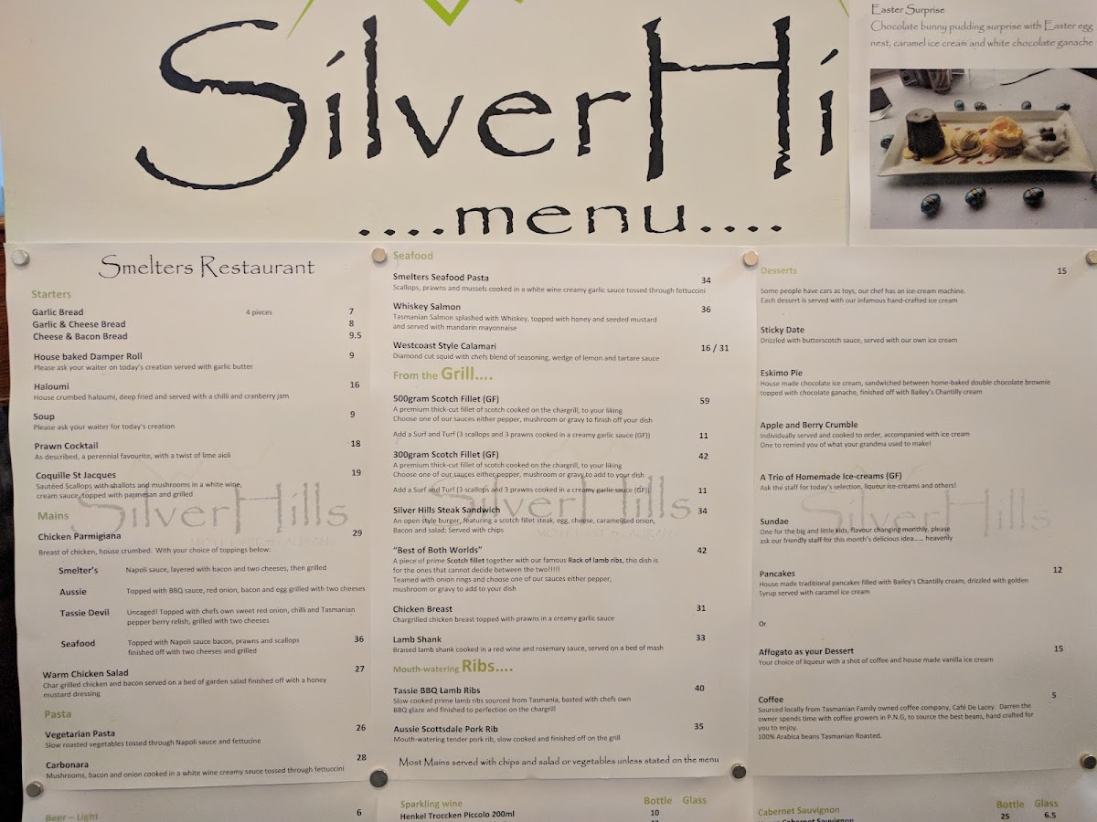 The menu at Smelters Restaurant at Silver Hills Motel offers a diverse range of comforting and hearty dishes. For starters, guests can enjoy classic options like Garlic Bread, Garlic & Cheese Bread, and Cheese & Bacon Bread, as well as the more substantial House Baked Damper Roll and Haloumi. The mains feature well-loved favorites, including the Aussie and Chicken Parmigiana, and unique options like Smelter's Seafood and the bold Tassie Devil. Pasta lovers can indulge in Vegetarian Pasta or the creamy Carbonara, while seafood enthusiasts can opt for the Smelters Seafood Pasta, Whiskey Salmon, or Westcoast Style Calamari. For those craving something from the grill, choices like the 500gram Scotch Fillet and 300gram Scotch Fillet are sure to satisfy. The dessert selection boasts sweet treats like Sticky Date, Eskimo Pie, and Apple and Berry Crumble, alongside a refreshing Trio of Homemade Ice-Creams and a classic Sundae. Parmigiana lovers can explore variations such as the Smelter's, Aussie, Tassie Devil Seafood, or a Plain Schnitzel. Other offerings include the Silver Hills Steak Sandwich, tender Chicken Breast, flavorful Lamb Shank, Tassie BBQ Lamb Ribs, and the Aussie Scottsdale Pork Rib, making the menu a delightful choice for a variety of tastes and preferences.